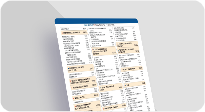O‘AHU AGENCIES † S‡ˆ‰Š‹ N‰Š AŒ‡Ž‘‰‰ † ALICE Gއ’Љ‰ • • HAWAII LITERACY 96240 €APIOLANI MEDICAL CENTER FOR WOMEN … PACIFIC HOUSE OF MISSION 8140 HAWAII MEALS ON WHEELS 70190 CHILDREN 74310 PACIFIC RESOURCES FOR EDUCATION • €CAA PRESCHOOLS OF HAWAII 96330 AND LEARNIN 8080 HAWAII MOTHERS’ MIL€ INC 96120 €EI€I EDUCATION LIIN INDEPENDENT PACIFIC RIM CHRISTIAN UNIERSITY 96810 HAWAII NATURE CENTER 70720 INSTITUTION 81860 PALAMA SETTLEMENT 96400 HAWAII OPERA THEATRE 79710 €IC€ START €ARATE 7970 PALI MOMI MEDICAL CENTER 8090 HAWAII PUBLIC HEALTH ASSOCIATION 96840 €IDS AT RIS€ MENTORIN PRORAMS PALOLO CHINESE HOME 96410 O‘AHU AGENCIES † • S‡ˆ‰Š‹ N‰Š AŒ‡Ž‘‰‰ † • ALICE Gއ’Љ‰ HAWAII PUBLIC HEALTH INSTITUTE 7640 „€AMP† HAWAII 70800 ARENTS AND CHILDREN HAWAII PUBLIC RADIO 80490 €IDS HURT TOO HAWAII 73910 •• BOY SCOUTS OF AMERICA ALOHA COUNCIL 96100 FRIENDS OF THE UH CANCER CENTER 71080 TOGETHER 96660 HAWAII SPEED AND UIC€NESS 81000 O UA ALIHI VALLEY O‘AHU AGENCIES FUR-ANEL FOUNDATION 8290 HAWAI‚I STATE COALITION AAINST •• ARTNERS IN DEVELOMENT BOYS GIRLS CLUB OF HAWAII 96110 COMREHENSIVE FAMILY • • AY MEN’S CHORUS OF HONOLULU 80760 DOMESTIC IOLENCE 72680 SERVICES 72660 FOUNDATION 96730 AUW DESIGNATIONS CAMP MO€ULE‘IA 8160 IRL SCOUTS OF HAWAII 96170 HAWAII THEATRE CENTER 80200 ALICE 80114 • GOODWILL HAWAII 96180 HAWAII YOUTH OPERA CHORUS 70030 €O€UA MAU 80410 PATCH - PEOPLE ATTENTIE TO CHILDREN 96420 2-1-1 80106 •• CATHOLIC CHARITIES HAWAII 96130 HAWAII YOUTH SERICES NETWOR€ 7030 €U ALOHA OLA MAU 72130 PBS HAWAII 7860 COMMUNITY CARE 80100 • GREGORY HOUSE ROGRAMS 71990 HAWAII YOUTH SYMPHONY ASSOCIATION 79720 €UA€INI FOUNDATION 71480 PLANNED PARENTHOOD REAT NORTHWEST HAWAI’I CENTER FOR TOMORROW’S LEADERS 80220 €U€UI CENTER 770 ALAS€A INDIANA €ENTUC€Y 70210 SAFETY NET 80105 CHAMBER MUSIC HAWAII 800 HAWAIIAN COMMUNITY UIDE DOS OF HAWAII „ADAPTIE AIDS • €UMU €AHUA THEATRE 76060 PO’AILANI INC 96430 CHAMINADE UNIERSITY OF HONOLULU 76210 CANINES … ADOCACY FOR THE BLIND† 96160 ASSETS‚ INCƒ 73210 €UPU 80420 PROƒECT HAWAI’I INC 81090 808 CLEANUPS 81300 CHILD FAMILY SERVICE 9610 HABILITAT 74020 LABOR COMMUNITY SERICES PRORAM 82020 A FAMILY TREE 72670 • HAWAIIAN HUMANE SOCIETY 7040 ROECT VISION HAWAII 800 LANA€ILA PACIFIC 70300 • ABILITIES UNLIMITED 96770 CLIMBHI 80810 • HALE IA 96190 HAWAII€IDSCAN 81140 LE ƒARDIN ACADEMY 74740 ACCESSURF HAWAII 70640 LEADERSHIP IN DISABILITIES … ACHIEEMENT PU‚A FOUNDATION 7390 COALITION FOR A DRU-FREE HAWAII 96690 HEALTHY MOTHERS HEALTHY HAWAII 3RS 7720 • OF HAWAII 96200 RAINBOW SCHOOLS 81690 ACHIEVE ZERO 80970 COMMON RACE 790 BABIES COALITION OF HAWAII 7130 READ TO ME INTERNATIONAL 73440 • COMMUNITY ASSISTANCE CENTER 96300 HAWAII 4-H FOUNDATION 7010 LEAHI AND MALUHIA FOUNDATION 7390 ADULT FRIENDS FOR YOUTH 70010 HAWAII ALLIANCE FOR COMMUNITY-BASED HELING HANDS HAWAII 9620 LEACY OF LIFE HAWAII 7410 REHABILITATION HOSPITAL OF THE PACIFIC COMPASSION FOR CANCER CAREIERS 81310 ECONOMIC DEELOPMENT „HACBED† 7420 • FOUNDATION 70442 AFTER-SCHOOL ALL-STARS HAWAII 80160 CONSORTIUM FOR HAWAII ECOLOICAL ENINEERIN LEGAL AID SOCIETY OF ‘AHA PUNANA LEO 73960 EDUCATION DBA MALAMA AINA FOUNDATION 8170 HISTORIC HAWAII FOUNDATION 79730 •• RYSE 8160 • HAWAII ALESEED CENTER FOR HNL TOOL LIBRARY 96800 HAWAII 9630 •• ALLIANCE FOR DRAMA EDUCATION 71730 CORRECTIONAL PEACE OFFICERS FOUNDATION 7880 LAW ECONOMIC USTICE 7080 RESPONSIE CAREIERS OF HAWAII 73900 CORETTE CENTER MINISTRIES 80240 HO’OLA NA UA 80370 MA€E-A-WISH HAWAII 70330 ALOHA HARVEST 79610 • RE-USE HAWAI‘I 80800 • HAWAII ARTS ALLIANCE 7240 MA€IN ENDS MEET 81870 • COUNCIL FOR NATIVE HAWAI‘I ASSOCIATION FOR THE EDUCATION HOA‚AINA O MA€AHA 72920 MALAMA LEARNIN CENTER 74910 RIER OF LIFE MISSION 7070 ALOHA MEDICAL MISSION 70630 RONALD MCDONALD HOUSE CHARITIES OF • HAWAIIAN ADVANCEMENT 73930 OF YOUN CHILDREN 72190 MANOA ALLEY THEATRE 80190 HAWAII AUTISM FOUNDATION 96740 HONOLULU COMMUNITY HAWAII 70680 ALHEIMER’S ASSOCIATION ALOHA CHAPTER 96700 CSI TRUST COMPANY 7600 • MARY€NOLL SCHOOL 7980 SACRED HEARTS ACADEMY 80300 AMERICAN CANCER SOCIETY 96010 DAUHTERS OF HAWAI’I 8180 HAWAII BONE MARROW DONOR REISTRY 80340 ACTION ROGRAM‚ INCƒ 7020 MENTAL HEALTH AMERICA OF HAWAI‚I 96360 AMERICAN CIIL LIBERTIES UNION OF HAWAII HAWAII BOO€ … MUSIC FESTIAL 8030 SAINT LOUIS SCHOOL 7610 DIAMOND HEAD THEATRE 79690 HAWAI’I BRANCH OF THE INTERNATIONAL HONOLULU HABITAT FOR SAMARITAN COUNSELIN CENTER HAWAII 70460 • MENTAL HEALTH O UA 9680 FOUNDATION 71110 DISABLED AMERICAN ETERANS CHARITABLE HUMANITY 70900 • SEAULL SCHOOLS INC 74160 AMERICAN DIABETES ASSOCIATION 70040 SERICE TRUST 72980 DYSLE‡IA ASSOCIATION „HIDA† 70730 AMERICAN HEART ASSOCIATION 96230 MID-PACIFIC INSTITUTE 76080 SHRINERS HOSPITALS FOR CHILDREN - DOMESTIC VIOLENCE • HAWAI’I CHILDREN’S ACTION HONOLULU MUSEUM OF ART 7340 MOA HAWAII 80430 HONOLULU 70470 • NETWOR 720 HONOLULU POLICE COMMUNITY FOUNDATION 710 MOILIILI COMMUNITY CENTER 96370 SOUNDIN ƒOY MUSIC THERAPY INC 70920 AMERICAN RED CROSS • ACTION CENTER DVAC 7260 HONOLULU THEATRE FOR YOUTH 7220 MONTESSORI COMMUNITY SCHOOL 72240 SECOH 96460 OF HAWAII 96020 HAWAII CHILDREN’S CANCER FOUNDATION „HCCF† 74040 HONWANƒI MISSION SCHOOL 80390 MADD HAWAII 70370 SPECIAL OLYMPICS HAWAII 70230 E DUCERE INC DBA HO’ALA SCHOOL 80330 HAWAII CONSERATION ALLIANCE FOUNDATION 76020 HUS FOR HAWAII’S SERIOUSLY ILL CHILDREN ST FRANCIS HOSPICE 81330 ARMED SERICES YMCA HAWAII 9600 EASTERSEALS HAWAII 70110 HAWAII CORD BLOOD BAN€ 8060 NATIONAL ALLIANCE ON MENTAL ILLNESS ASSETS SCHOOL 96070 EPIC ‚OHANA 73660 AND THEIR FAMILIES 9690 HAWAII OR NAMI HAWAII 96630 HAWAII FIDO SERICE DOS 72930 SAINT FRANCIS HEALTHCARE ASSISTIE TECHNOLOY RESOURCE CENTERS EPILEPSY FOUNDATION OF HAWAII 96220 HUI MALAMA O