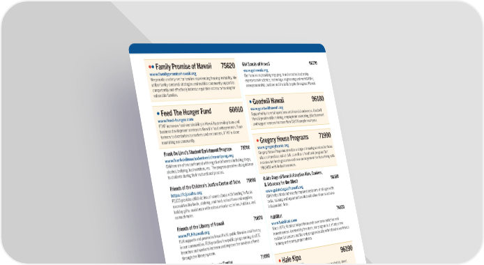 ••Family Promise of Hawaii 75620 Girl Scouts of Hawaii 96170 www.familypromisehawaii.org www.gshawaii.org We provide a safety net for families experiencing housing instability. We Our focus is on providing engaging, transformative leadership utilize family-centered strategies and mobilize community support to experiences in science, technology, engineering and math(STEM), competently and effectively increase equitable access to housing for entrepreneurship, outdoor and life skills to girls throughout Hawaii. vulnerable families. •Goodwill Hawaii 96180 •Feed The Hunger Fund 60010 www.goodwillhawaii.org www.feed-hunger.com Supported by its retail operations and financial endeavors, Goodwill FTHF increases food sustainability in Hawaii by providing loans and Hawaii provide skills training, employment counseling, job placement business development services to Hawaii’s food entrepreneurs. From and support services for more than 10,000 people each year. farmers to distributors to markets and restaurants, FTHF is about nourishing our community. •Gregory House Programs 71990 Frank De Lima’s Student Enrichment Program 79700 www.gregoryhouse.org www.frankdelimastudentenrichmentprog.org Gregory House Programs provides a range of housing services for those Children are often confronted with negative influences including drugs, who are homeless and at-risk, as well as a food bank program that alcohol, bullying, bad nutrition, etc. The program provides vital guidance includes hot lunch/groceries and case management for those living with to students during their maturational process. HIV/AIDS with limited resources. Friends of the Children’s Justice Center of Oahu 75090 Guide Dogs of Hawaii (Adaptive Aids, Canines, https://fcjcoahu.org & Advocacy for the Blind) 96160 FCJCO provides child victims of severe abuse with funding for basic www.guidedogsofhawaii.org necessities like beds, clothing, and food; school fees and supplies; GDH helps blind and visually impaired residents of all ages with holiday gifts; assistance with extracurricular activities, hobbies, and tools, training and opportunities that will allow them to achieve so much more. independent lives. Friends of the Library of Hawaii 70070 Habilitat 74020 www.FLHhawaii.org www.habilitat.com FLH supports and promotes Hawai‘i’s 51 public libraries and literacy Since 1971, Habilitat helped thousands overcome addiction and in our communities. FLH provides free public programming at all 51 homelessness. Licensed by the state, our program is 1 of only a few branches and works to increase and improve the services offered residential centers and the only program locally with intensive workforce through the library system. training and reentry preparedness. Friends of the UH Cancer Center 71080 www.uhcancercenter.org •Hale Kipa 96190 The Friends of the UH Cancer Center benefits the community by www.halekipa.org providing education and ancillary support of cancer research being done Hale Kipa offers outreach, prevention, emergency shelter, street by the UH Cancer Center. outreach, independent living, foster care, and treatment services to Fur-Angel Foundation 82590 youth and their families to help them succeed and thrive. www.furangelfoundation.org Hawaii 3Rs 75720 FAF is a non-profit dog rescue on the island of Oahu, Hawaii. We provide www.hawaii3rs.com foster care to houseless dogs through our trusted network of fosters, Since 2001 Hawaii 3Rs brought together donations from individuals and and educate our community on animal welfare and proper caregiving. private businesses combined with volunteer sweat equity to conduct Gay Men’s Chorus of Honolulu 80760 repair and maintenance projects in public schools, saving the state more than $40 million since 2001 www.GMCofH.org We uplift and enlighten the community by sharing male voices in song. Hawaii 4-H Foundation 70150 We vibrantly celebrate the gift of life and song with all who witness our www.ctahr.hawaii.edu/4h/ performances. Through our musical culture, we foster community for 4-H strives to help young people “make the best better” through new members and old alike. programs that emphasize learning by doing.