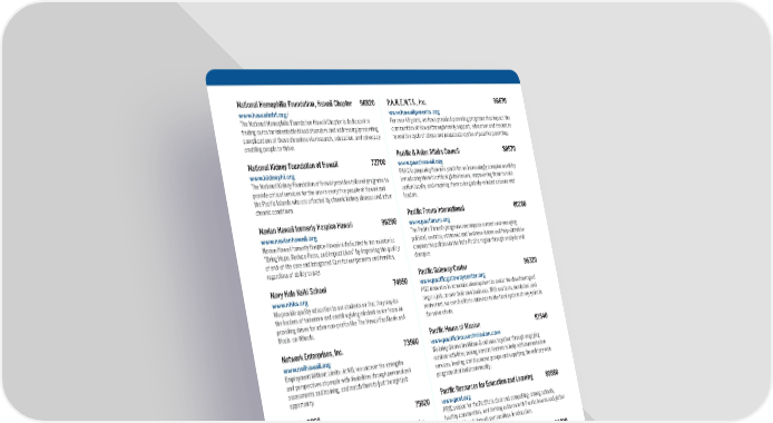National Hemophilia Foundation, Hawaii Chapter 96820 P.A.R.E.N.T.S., Inc. 96670 www.hawaiinhf.org/ www.hawaiiparents.org The National Hemophilia Foundation Hawaii Chapter is dedicated to For over 45 years, we have provided parenting programs that impact the finding cures for inheritable blood disorders and addressing/preventing communities of Hawaii through family support, education and resources complications of these disorders via research, education, and advocacy to end the cycle of abuse and perpetuate cycles of positive parenting. enabling people to thrive. Pacific & Asian Affairs Council 80570 National Kidney Foundation of Hawaii 72700 www.paachawaii.org www.kidneyhi.org PAAC is preparing Hawaii’s youth for an increasingly complex world by The National Kidney Foundation of Hawaii provides tailored programs to introducing them to critical global issues, empowering them to take provide critical services for the one in every five people of Hawaii and action locally, and inspiring them to be globally-minded citizens and the Pacific Islands who are affected by chronic kidney disease and other leaders. chronic conditions. Pacific Forum International 80180 Navian Hawaii formerly Hospice Hawaii 96290 www.pacforum.org www.navianhawaii.org The Pacific Forum’s programs encompass current and emerging Navian Hawaii formerly Hospice Hawaii is dedicated to our mission to political, security, economic and business issues and help stimulate “Bring Hope, Reduce Fears, and Impact Lives” by improving the quality cooperative policies in the Indo-Pacific region through analysis and of end-of-life care and Integrated Care for our patients and families, dialogue. regardless of ability to pay. Pacific Gateway Center 96320 Navy Hale Keiki School 74950 www.pacificgatewaycenter.org www.nhks.org PGC innovates in economic development to assist the disadvantaged We provide quality education to our students so that they may be to get a job, or own their own business. With our farm, incubator, and the leaders of tomorrow and enstill a giving mindset as we focus on restaurant, we can facilitate entrance to the food system at any point in providing drives for other non-profits like The Hawaii Foodbank and the value chain. Meals-on-Wheels. Pacific House of Mission 81540 Network Enterprises, Inc. 73560 www.pacifichouseofmission.com www.neihawaii.org We bring diverse traditions & cultures together through engaging Employment Without Limits: At NEi, we uncover the strengths outdoor activities; raising servant-leaders to help with humanitarian and perspectives of people with disabilities through personalized services, leading civil discourse groups and supplying the military with assessments and training, and match them to just the right job programs that build community. opportunity. Pacific Resources for Education and Learning 80580 Oahu SPCA 75920 www.prel.org www.oahuspca.org PREL’s vision for the Pacific is clear and compelling: strong schools, Oahu SPCA is the only no-kill shelter in Hawaii. The organization has healthy communities, and thriving cultures with Pacific hearts and global grown exponentially during the past few years and needs additional help minds, achieved through partnerships in education. to make sure all dogs, cats, puppies and kittens find their forever home. Pacific Rim Christian University 96810 Ohana Komputer 73920 www.pacrim.edu www.ohanakomputer.org We inspire, equip, and empower our students to intentionally explore Ohana Komputer provides computer application training to all-ages their God-given purpose to become effective leaders in the ministry using an age-appropriate technology curriculum that focuses on the and marketplace. Microsoft Office Suite and Google Docs Palama Settlement 96400 Olelo Community Media 76100 www.palamasettlement.org www.olelo.org Palama Settlement serves families and individuals through the food Olelo Community Media is Oahu’s nonprofit community public, pantry and refers those in need of additional support to community education, and government (PEG) access provider created to empower resources. Educational and recreational programs are available for the voice of the community. When our voices thrive, so does our children, youth, and senior adults. community.