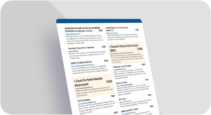 CONSORTIUM FOR HAWAII ECOLOGICAL ENGINEERING Disabled American Veterans Charitable EDUCATION dba Malama Aina Foundation 81570 Service Trust 72980 www.malamaaina.org https://cst.dav.org MAF supports students to excel in STEAM through hands-on, place- The DAV (Disabled American Veterans) Charitable Service Trust is based applications of traditional values and cultural practices, with dedicated to one, single purpose: empowering veterans to lead high- the goal of increasing interest in STEAM-related careers and a greater quality lives with respect and dignity. appreciation of our land/culture. Correctional Peace Officers Foundation 75880 •Domestic Violence Action Center www.cpof.org (DVAC) 72460 Non-profit charity for correctional staff and their families by providing line-of-duty death benefit and catastrophic assistance in cases of www.domesticviolenceactioncenter.org accident or illness. DVAC provides crisis support, safety planning, legal representation, onsite court outreach, long-term advocacy and housing for survivors of CORVETTE CENTER MINISTRIES 80240 family violence, as well as outreach, training, and technical assistance www.corvettecenterministries.org for the community. Corvette Center Ministries reduces homelessness one individual at a time by empowering him or her through housing, programs, and E Ducere, Inc. dba Ho’ala School 80330 resources. Our motto is “Transformed Lives, Changed Communities!” www.hoalaschool.org Help to create and foster school and home environments where children develop habits of responsibility, respect, resourcefulness, •Council for Native Hawaiian and responsiveness through example and experience, and as a result, Advancement 73930 flourish in their community. www.hawaiiancouncil.org Easterseals Hawaii 70110 CNHA partners with other community organizations and leaders to www.EasterSealsHawaii.org enhance the cultural, economic, political, and community development We provide more than 200,000 hours of direct service annually to of Native Hawaiians. individuals and families across the state. All funds raised by Easterseals Hawaii remain in Hawaii and help us carry on our tradition of creating CSI Trust Company 75600 solutions and changing lives. www.csitrustcompany.org EPIC ‘Ohana 73660 Provide personalized financial management and fiduciary solutions to Hawaii’s families – our kupuna, individuals with disabilities, and those www.epicohana.org for whom an individual trustee or bank trust company may not be EPIC ‘Ohana provides several programs and processes that strengthen appropriate or feasible. families and support young people in the child welfare system. Daughters of Hawai’i 81580 Epilepsy Foundation of Hawaii 96220 www.daughtersofhawaii.org www.epilepsyhawaii.org We strive to keep a piece of Hawaii’s history alive. Programs at the three EFH provides epilepsy information and education like Seizure historic sites provide a portal for the community to walk in the footsteps Recognition and First Aid Certification Training, advocacy, support of our ali‘i, to learn about the strength and achievements of these groups, referrals, including various seizure awareness & safety initiatives inspirational women. ensuring a seizure-safe community. Diamond Head Theatre 79690 Family Hui Hawaii 81590 www.diamondheadtheatre.com www.familyhuihawaii.org Community theatre offering six theatrical productions each season. Family Hui Hawaii empowers families and caregivers to do their best in Presents musicals, plays and traditional favorites. Provides volunteer parenting and to take an active role in supporting other families in the opportunities. Offers year-round performing arts classes. community. Our expertise is in peer learning, creating a safe place to share and learn. Family Programs Hawaii 73690 www.familyprogramshawaii.org Family Programs Hawaii is a 501(c)(3) social service agency dedicated to strengthening youth and families, especially those involved in the child welfare system in order to empower our local communities.