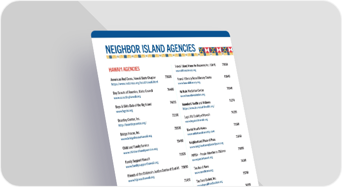 NEIGHBOR ISLAND AGENCIES HAWAI‘I AGENCIES Hawaii Island Home for Recovery Inc. (HIHR) 75830 www.hihrecovery.org American Red Cross, Hawaii State Chapter 75520 Hawaii Literacy/Kona Literacy Center 83640 https://www.redcross.org/local/hawaii.html www.hawaiiliteracy.org Boy Scouts of America, Aloha Council 74400 Ku‘ikahi Mediation Center 75840 www.scoutinghawaii.org www.hawaiimediation.org Boys & Girls Club of the Big Island 74010 Kumukahi Health and Wellness 71270 www.bgcbi.org https://www.kumukahihealth.org/ Brantley Center, Inc. 72100 Legal Aid Society of Hawai‘i 74320 http://brantleycenter.org/ www.legalaidhawaii.org Bridge House, Inc. 75530 Mental Health Kokua 71560 www.bridgehousehawaii.org www.mhkhawaii.weebly.com Child and Family Service 75490 Neighborhood Place of Puna 71640 www.childandfamilyservice.org www.neighborhoodplaceofpuna.org Family Support Hawai‘i 71020 PATCH—People Attentive to Children 75850 www.familysupporthawaii.org www.patchhawaii.org Friends of the Children’s Justice Center of East HI 75090 The Arc of Kona 74100 www.fcjceasthawaii.org www.arcofkona.org Full Life 71410 The Food Basket, Inc. 75780 www.fulllifehawaii.org/ www.hawaiifoodbasket.org Girl Scouts of Hawaii 73490 The Salvation Army Hilo Temple Corps 74180 www.gshawaii.org hilo.salvationarmy.org Habitat for Humanity Hawai‘i Island 71230 The Salvation Army Kona Corps 74360 www.habitathawaiiisland.org https://kona.salvationarmy.org/ Hamakua Youth Foundation, Inc. 75800 West Hawaii Mediation Center 75560 https://www.hamakuayouthcenter.org/ www.whmediation.org Hawaii Care Choices 74080 www.hawaiicarechoices.org YWCA Hawaii Island 75500 www.ywcahawaiiisland.org Hawaii Island Adult Care, Inc 71910 www.hawaiiislandadultcare.org
