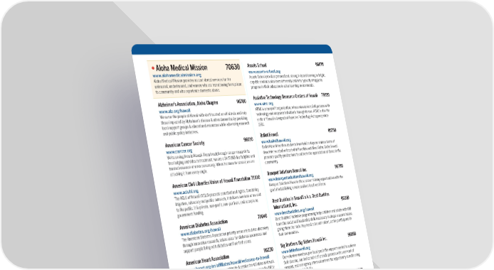 •Aloha Medical Mission 70630 Assets School 96070 www.alohamedicalmission.org www.assets-school.org Aloha Medical Mission provides no cost dental services for the Assets School provides personalized, strength-based learning to bright, uninsured, underinsured, and women who are transitioning from prison capable students who learn differently and who typically struggle to to community and who experience domestic abuse. progress in their education in other learning environments. Alzheimer’s Association, Aloha Chapter 96700 Assistive Technology Resource Centers of Hawaii 75010 www.alz.org/hawaii www.atrc.org We serve the people of Hawaii with staff located on all islands and help ATRC is a nonprofit organization, whose mission is to link persons with those impacted by Alzheimer’s disease & other dementias by providing technology and empower individuals through its use. ATRC is also the local support groups & educational resources while advancing research state of Hawaii’s designated Assistive Technology Act agency since and public policy initiatives. 1991. American Cancer Society 96010 Ballet Hawaii 80750 www.cancer.org www.ballethawaii.org We’re saving lives in Hawaii. From breakthrough cancer research to Ballet Hawaii teaches students from keiki to kupuna various forms of free lodging and rides to treatment, we are a 24/7/365 live helpline and dance in two studios located in Honolulu and West Oahu. Ballet Hawaii trusted resource at www.cancer.org. When it comes to cancer, we are presents quality productions to cultivate the appreciation of dance in the attacking it from every angle. community. American Civil Liberties Union of Hawaii Foundation 71110 Banquet Solutions Hawaii Inc. 96780 www.acluhi.org www.banquetsolutionshawaii.org The ACLU of Hawaii (ACLU) protects constitutional rights. Combining Banquet Solutions Hawaii offers career training opportunities with the litigation, advocacy and public outreach, it delivers services at no cost goal of establishing a more resilient local workforce. to the public. It is private, non-profit, non-partisan, and accepts no Best Buddies in Hawai’i a.k.a. Best Buddies government funding. International, Inc. 80310 American Diabetes Association 70040 www.bestbuddies.org/hawaii www.diabetes.org/hawaii Best Buddies’ inclusive programming helps children and adults with IDD The American Diabetes Association priority areas are to drive discovery learn the social and leadership skills necessary to shape a secure future, through innovative research, raises voice for diabetes awareness and giving them the tools they need to be self-reliant, active participants in support people living with diabetes until we find a cure. their communities. American Heart Association 96230 Big Brothers Big Sisters Hawaii Inc. 96090 www.heart.org/en/affiliates/hawaii/welcome-to-hawaii www.bbbshawaii.org Heart Disease is the #1 killer worldwide & stroke the #3 killer in Hawaii. Our volunteer mentors give local youth the support needed to achieve Even when those conditions don’t result in death, they cause disability their dreams, our dedicated staff provide parents with a network of and diminish quality of life. We want to see a world free of cardiovascular support, and our agency offers volunteers the opportunity to make a big disease and stroke. difference in a child’s life. Bishop Museum 80740 •American Red Cross of Hawaii 96020 www.bishopmuseum.org www.redcross.org/hawaii We are the stewards of our natural and cultural heritage. A source Nonprofit humanitarian organization providing compassionate relief to where learning comes to life. As people of the Pacific, we have unique disaster victims, disaster preparedness education, lifesaving training, perspectives to share. We serve those who have come before, are here and emergency communication for military families. now, and yet to arrive. Armed Services YMCA Hawaii 96050 Blood Bank of Hawaii 71070 www.asymcahi.org www.BBH.org Armed Services YMCA Hawaii has served Hawaii’s military members and BBH is the sole blood provider for our state, serving all 18 hospitals & their families for 104 years, providing innovative programs and services all of Hawaii’s patients’ blood needs. Lives depend on BBH operating to help navigate the challenges of military life. 24/7. Without blood, many hospital programs could not exist & importing blood is cost prohibitive.
