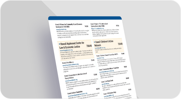 Hawaii Alliance for Community-Based Economic Hawai‘i Branch of The International Development (HACBED) 74250 Dyslexia Association (HIDA) 70730 www.hacbed.org https://hi.dyslexiaida.org HACBED works as an intermediary to lift up the gifts as well as struggles HIDA provides information, resource publications, webinars and other of families on different islands by providing support to individuals, virtual events for youth, parents, teachers and others interested in nonprofit community-based organizations, and multi-sector networks helping struggling readers; promotes teacher training in Structured serving the most vulnerable. Literacy instructional approaches. •Hawaii Appleseed Center for •Hawai’i Children’s Action Law & Economic Justice 70840 Network 72440 www.hiappleseed.org www.hawaii-can.org At Hawaii Appleseed, our work is about people. The issues we work on— We work to ensure all keiki in Hawai’i are safe, healthy and ready to housing, food, budget & tax, and racial equity—are important because learn. they ensure people have access to shelter, sustenance, & the means to not only survive, but to thrive. Hawaii Children’s Cancer Foundation (HCCF) 74040 Hawaii Arts Alliance 72450 www.hccf.org With the average length of treatment at 1-3 years, HCCF’s largest www.hawaiiartsalliance.org program, Financial Assistance, helps defray medical and living expenses The Hawai‘i Arts Alliance works to support arts nonprofits statewide for families who have a child in cancer treatment, thereby reducing the and provide access to the arts through in-school and out-of-school arts stress they experience. programs. Hawaii Conservation Alliance Foundation 76020 Hawai‘i Association for the Education of www.hawaiiconservation.org Young Children 72190 Our strategy restores, protects and preserves Hawai‘i natural resources. www.hawaiikeiki.org Supports the conservation of native ecosystems, which sustains our HIAEYC provides support to early childhood educators and organizations collective values and livelihoods. to improve the quality of care and education for young children birth to age 8 through professional development and support for NAEYC Hawaii Cord Blood Bank 80560 accreditation. www.hcbb.org We collect and provide life-saving cord blood stem cells for the Hawaii Autism Foundation 96740 treatment of blood disorders and leukemia to Hawaii’s multi-racial/multi- www.hawaiiautismfoundation.org ethnic population. Work with autism families to find where community support is needed and fund programs that bring solutions and a more inclusive and Hawaii FIDO Service Dogs 72930 equitable life for those with autism. www.hawaiifido.org Our dogs enhance quality of life, increase independence and offer Hawaii Bone Marrow Donor Registry 80340 healing to our communities with a focus on Veterans. We also work in www.bethematchhawaii.org partnership to bring the healing power of dogs to work in therapeutic, Help patients with blood diseases, like leukemia, find matching donors, clinical, and vocational settings. as matches are generally found within the same race. So Hawaii’s diversity is important for our local patients in need. •Hawaii Foodbank, Inc. 96640 HAWAII BOOK & MUSIC FESTIVAL 80350 www.hawaiifoodbank.org www.hawaiibookandmusicfestival.org Serving Hawaii since 1983, Hawaii Foodbank and its network of more HBMF is the most content-rich event in the state, a prime forum for than 200 food partner agencies provide food assistance to the 1 in 6 Hawaii authors to present their current works, and an indispensable Hawaii residents currently facing food insecurity. public forum for Hawaii’s thought leaders in dialogue about the major issues confronting Hawaii. Hawai’i Forest Institute (HFI) 81600 www.hawaiiforestinstitute.org HFI educates and mobilizes the general public to care about forests and actively participate in their conservation. In 2020 HFI, planted 2,454 seedlings; managed 276 acres of forest habitat; and benefited an estimated 5,251 people.