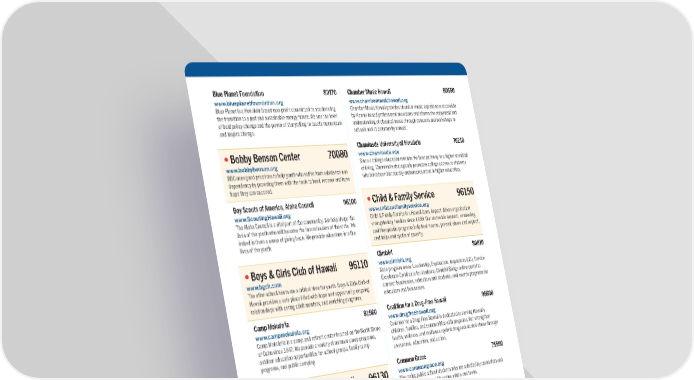 Blue Planet Foundation 80170 Chamber Music Hawaii 80550 www.blueplanetfoundation.org www.chambermusichawaii.org Blue Planet is a Honolulu-based non-profit committed to accelerating Chamber Music Hawaii provides chamber music experiences statewide the transition to a just and sustainable energy future. We use the lever by Hawaii-based professional musicians and shares the enjoyment and of bold policy change and the power of storytelling to create momentum understanding of classical music through concerts and workshops in and inspire change. schools and at community venues. Chaminade University of Honolulu 76210 •Bobby Benson Center 70080 www.chaminade.edu www.bobbybenson.org Since a college education remains the best pathway to a higher standard BBC uses good practices to help youth who suffer from substance use of living, Chaminade strategically promotes college access to students dependency by providing them with the tools to heal, recover and have who have been historically underrepresented in higher education. hope they can succeed. Boy Scouts of America, Aloha Council 96100 •Child & Family Service 96150 www.ScoutingHawaii.org www.childandfamilyservice.org The Aloha Council is a vital part of the community. We help shape the Child & Family Service is a Hawaii-born, impact-driven organization lives of the youth who will become the future leaders of the state. We strengthening families since 1899. Our statewide support, counseling, imbed in them a sense of giving back. We provide adventure into the and therapeutic programs help heal trauma, prevent abuse and neglect, lives of the youth. and helps end cycles of poverty. ClimbHI 80810 •Boys & Girls Club of Hawaii 96110 www.climbhi.org www.bgch.com Main program areas: Leadership, Exploration, Inspiration (LEI); Service The after-school hours are a critical time for youth. Boys & Girls Club of Excellence Certificate for students; ClimbHI Bridge online portal to Hawaii provides a safe place filled with hope and opportunity, ongoing connect businesses, educators and students; and awards programs for relationships with caring adult mentors, and enriching programs. educators and businesses. Camp Mokule‘ia 81560 Coalition for a Drug-Free Hawaii 96690 www.campmokuleia.org www.drugfreehawaii.org Camp Mokule‘ia is a camp and retreat center located on the North Shore Coalition for a Drug-Free Hawaii is dedicated to serving Hawaii’s of Oahu since 1947. We provide a variety of summer camp programs, children, families, and communities with programs that strengthen outdoor education opportunities for school groups, family camp health, wellness, and resilience against drug and alcohol abuse through programs, and public camping. awareness, education, and action. Common Grace 75590 ••Catholic Charities Hawaii 96130 www.commongrace.org www.catholiccharitieshawaii.org Mentoring public school students who are selected by counselors and We are a community of hope, over 300 employees strong, statewide. staff and match them with caring adults and teens. We offer human services programs assisting over 40,000 children, Community Assistance Center 96300 seniors, veterans, families and individuals in need annually through www.cachawaii.org direct support and advocacy services. We make our community safer by assisting offenders, ex-offenders and Center for Tomorrow’s Leaders 80220 troubled youth to assume productive membership in their community. www.CTLHawaii.org Compassion for Cancer Caregivers 81310 With signature high school and post-secondary programs, CTL is www.CompassionForCancerCaregivers.org creating an atmosphere for student leaders to be discovered and Do you know someone with cancer? Do you know what to say and do? We trained. In doing so, CTL provides a leadership pipeline for Hawaii’s do. We’ve walked in their shoes. We conduct classes for organizations to businesses, government, and all sectors. create networks of support for cancer caregivers and/or patients.